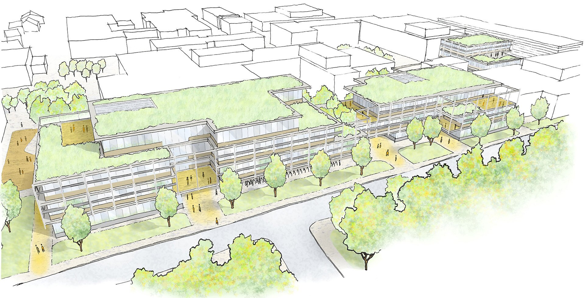 While the street frontage forms a clearly defined edge that establishes a strong architectural boundary to the city, the elevations facing the campus are more varied. Green facades strengthen the relationship between the building and its outdoor context. New and existing structures come together to form a cohesive ensemble organized around a central courtyard, which offers generous outdoor common areas for gathering, events, and informal exchange among students and faculty. Tiny forests in the courtyard and north of the parking structure offer additional retention areas.