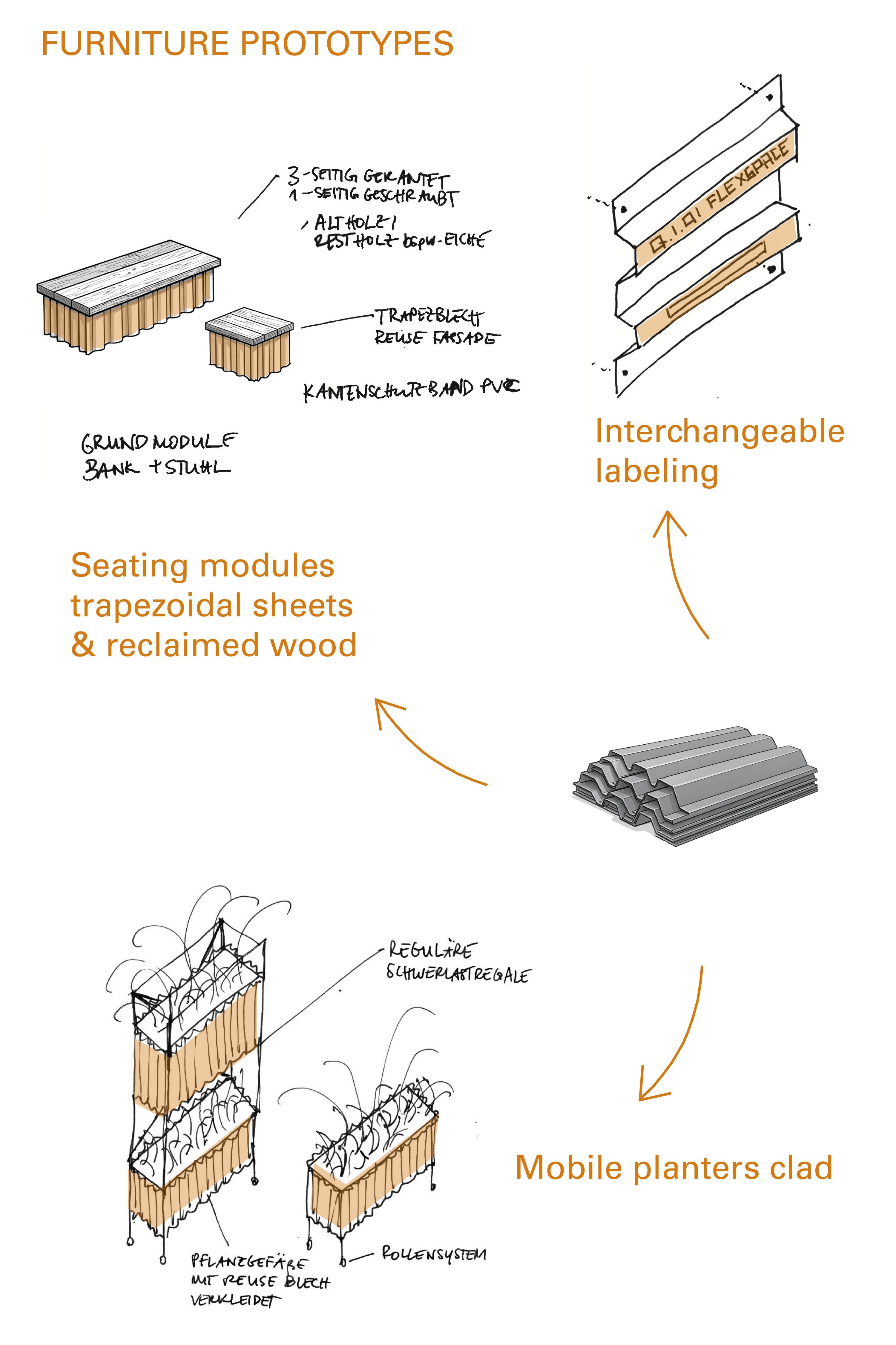 As a contribution to resource conservation, the ventilated aluminum trapezoidal sheet metal façade will be constructed using reused trapezoidal sheets. Contact was established with SWM Munich, which is dismantling a ventilated façade as part of a renovation process. Following expert assessment, this façade can potentially be reused for the new Campus Building Q. Offcut material will be repurposed into foyer furniture and planters.