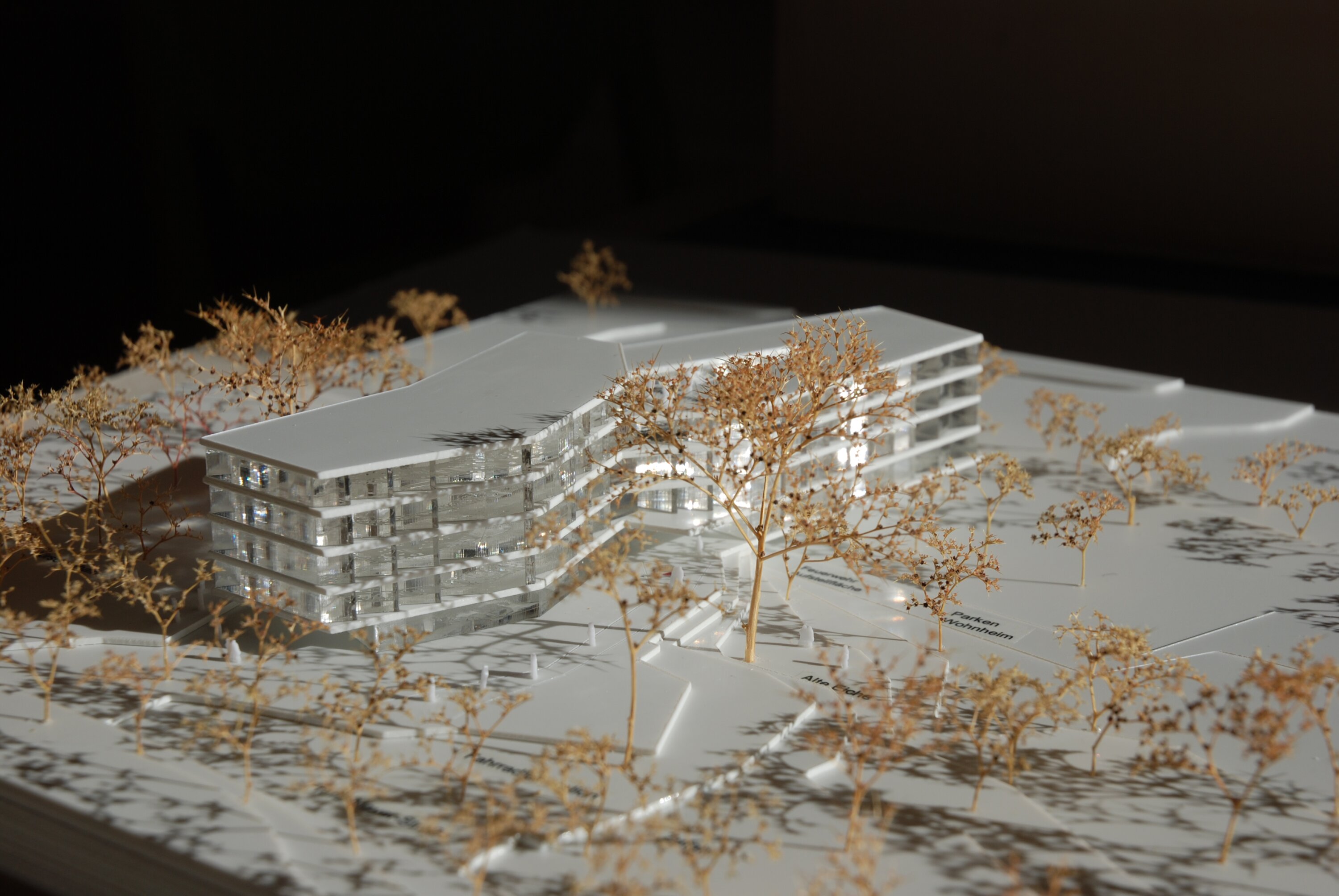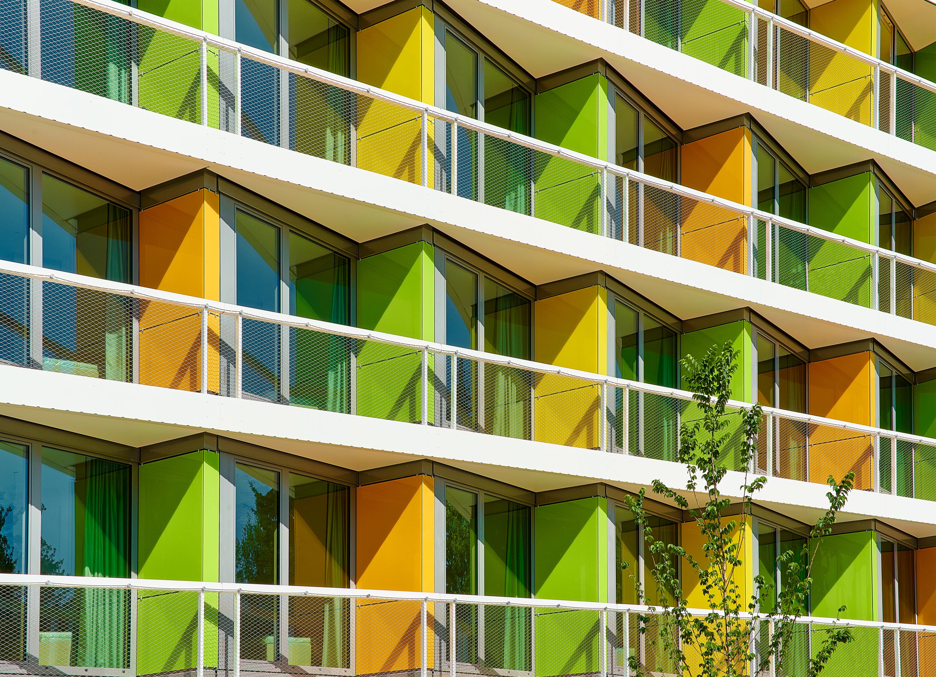 In contrast to the accented coloring of the communal areas, the individual student rooms, each with their own balcony, built-in kitchen, bathroom of finished sheet-metal components, are kept warm and tactile and are furnished with polygonal wooden furniture. Heating is provided by finned tubes — mounted vertically next to the window frames — that have an integrated ventilation system. This type of heating regulates the intake of fresh air, thus guaranteeing optimal air quality and a comfortable environment for residents. The exterior of the building is defined by the balconies’ play of light and shadow. The distinctive coloring of the closed glass panels is inspired by the seasonal color changes of the surrounding trees. The slanting elements of the facades help block the view to neighboring balconies while at the same time offering structural protection from the sun. The continuous handrail and parapets, filled with stainless-steel meshwork, reinforce the appearance of transparency and, together with the light-colored banding, give horizontal structure to the facade.