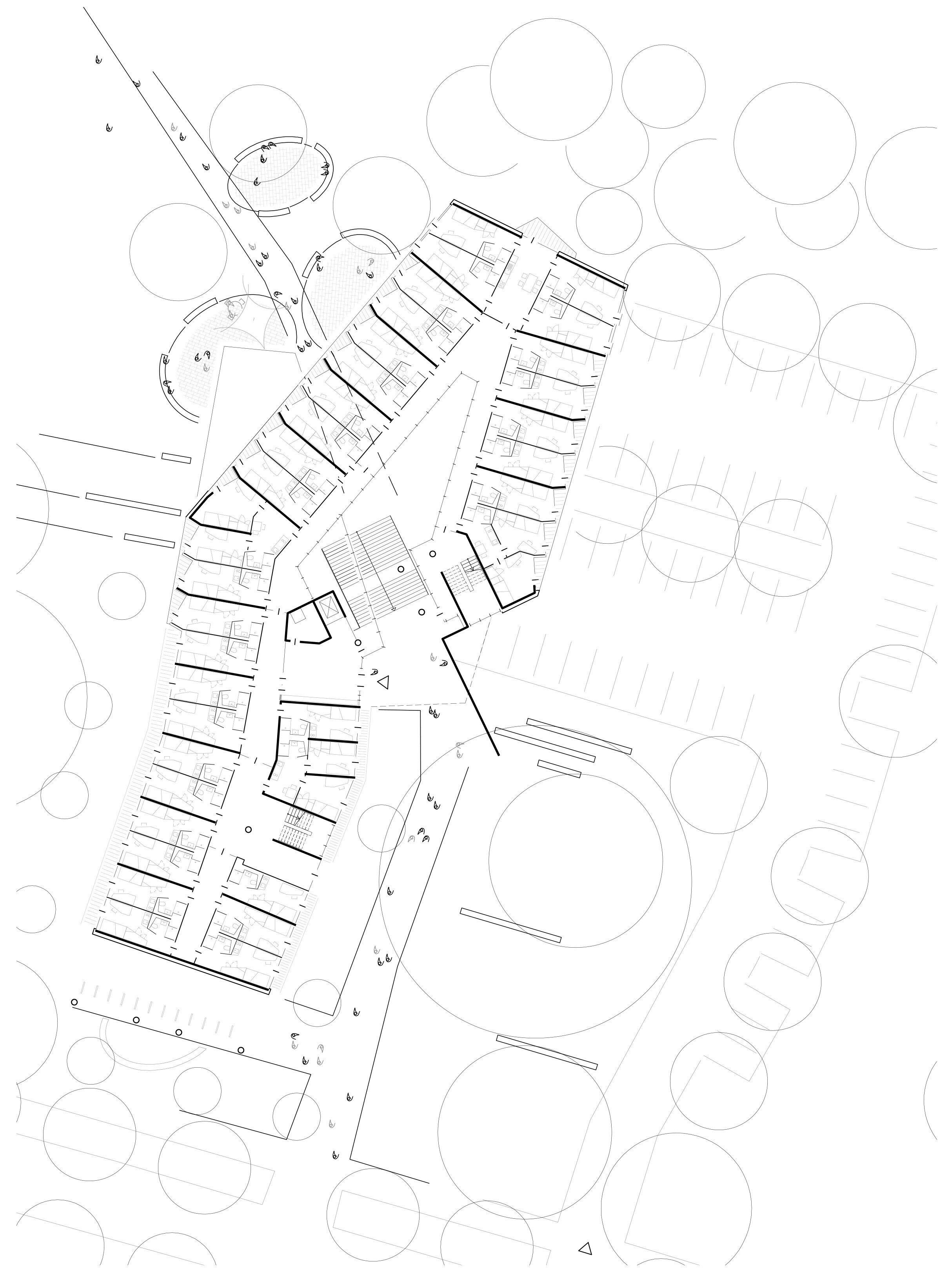 The skewed axial alignment of the elongated, five-story building, which is staggered in height along its eastern side, allows the structure to keep its distance from the existing oak and helps create a striking entrance area. The northwest side offers additional space for premium, open-air leisure areas. The core idea behind the design was to connect Franz-Mayer-Strasse to the south with the building and stretch of green to the north. A newly created public footpath offers the main means of access and opens out onto a wide and inviting set of stairs located near the entrance area, which leads down to a protected courtyard and doubles up as a stage for events and other purposes. The public communal areas on the garden level offer seating, a barbecue area, and other recreational amenities both inside and outside the building allowing the hustle and bustle of student life to play out undisturbed. Islands of green are embedded around the site, offering a space for students from all over the world to meet and converse, thus filling the Nibelungen complex with life.