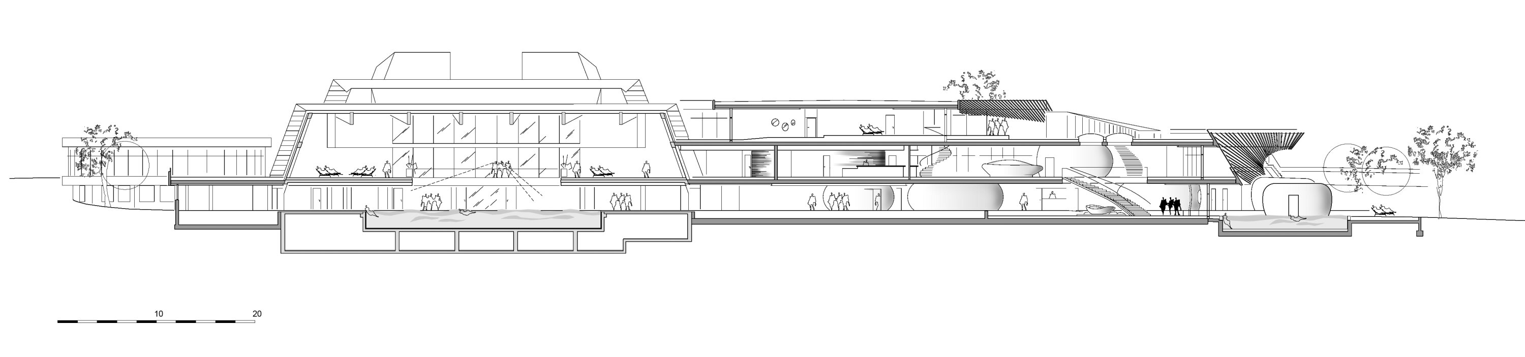 Our proposal envisioned placing all additional facilities in a newly designed landscape surrounding the original building. The formal language of the original building is reflected in the curved, greened terraces, allowing the original main hall of the spa to retain its dominant, sculptural presence. The internal organization and design are shaped by two key factors: the landscaped terraces, aligned along the valley’s natural east-west axis, and the building’s multi-story structure, a rather unusual feature for a spa. A new atrium, inserted into the wellness wing, constitutes the geometric and social heart of the refurbished thermal spa.