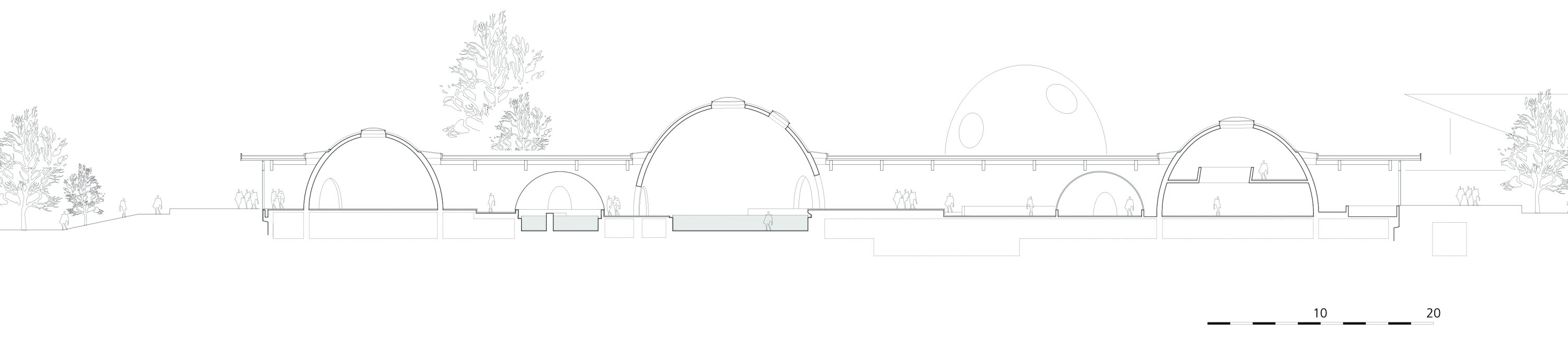 Each dome, conceived as a mostly opaque volume punctuated by circular openings, has its own identity shaped by varying natural and artificial light, materials, water features, and acoustics. The climate concept capitalizes on the spatial separation between the domes, hall, restaurant, and lounging areas to optimize comfort and energy efficiency. By supplying air to the hall and extracting it from the domes—where water surfaces and humidity are concentrated—the design creates a warm, humid climate inside the domes and a cooler, drier one in the hall. The glazed hall also functions as a solar-heated winter garden.