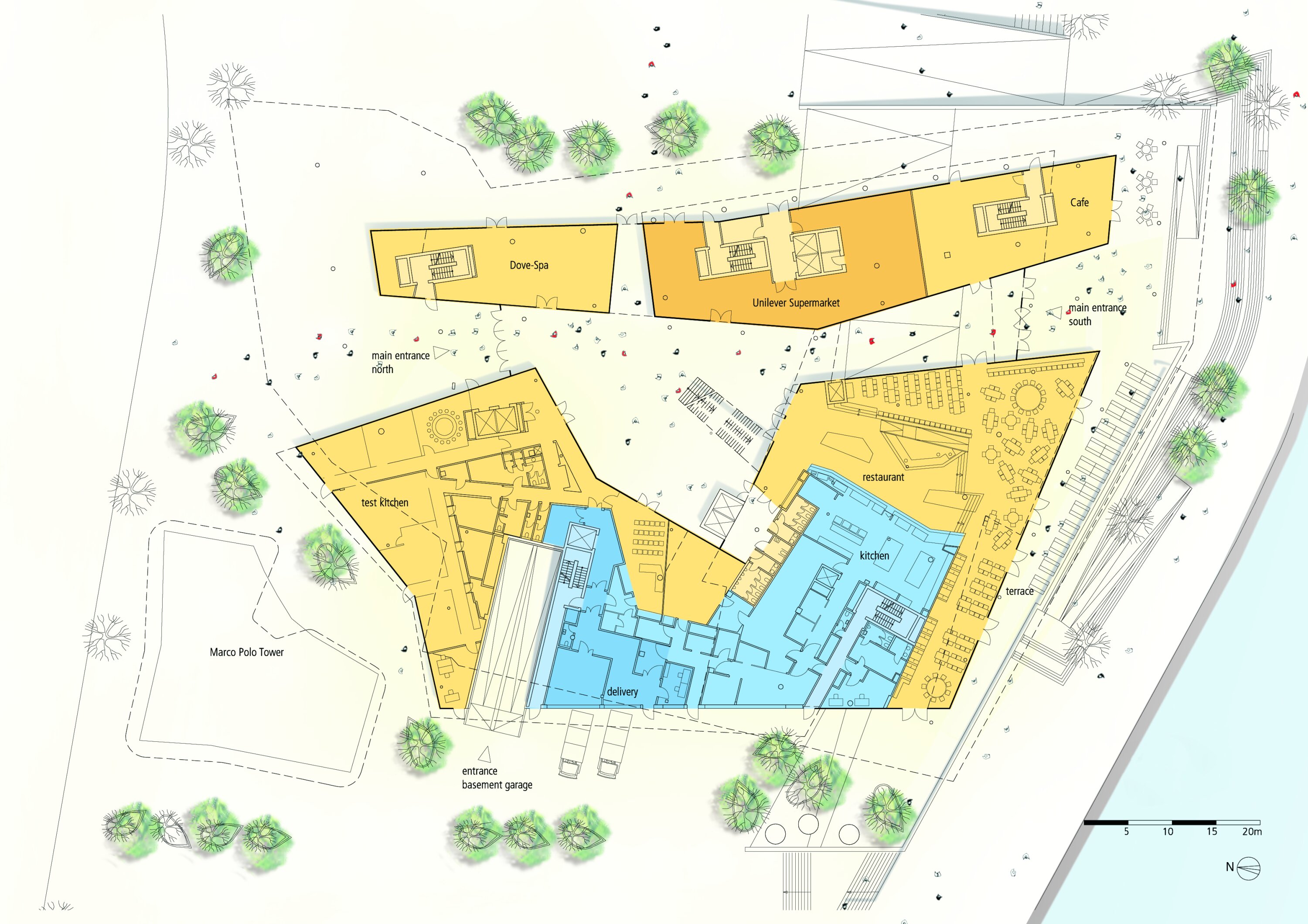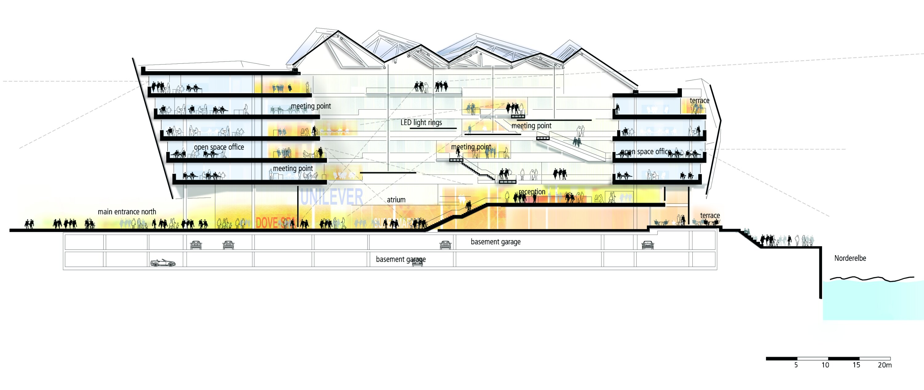 The Unilever headquarters for Germany, Austria, and Switzerland occupies a prominent site along the Elbe in Hamburg’s HafenCity. Located at the end of the route from the city center to new waterfront landmarks—such as the cruise ship terminal and Strandkai promenade—the building both defines and opens itself to the urban fabric, inviting public engagement.